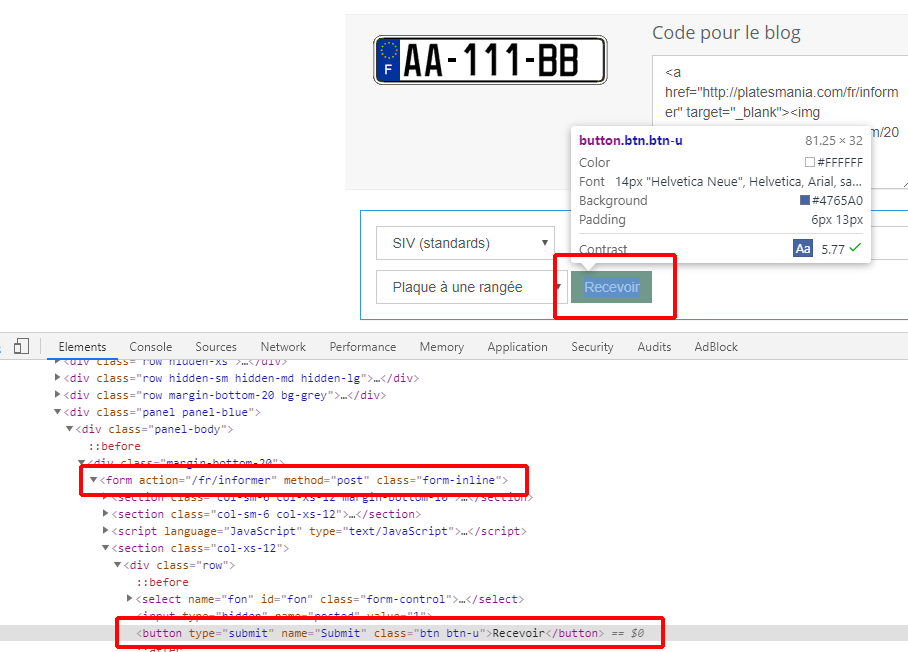 Avant de se lancer dans le code, il va falloir faire une petite analyse du site, pour savoir comment générer une plaque en utilisant l'API, sans que celle-ci nous soit indiqué explicitement. En effet, contrairement à des outils tel que Sélénium, Scrapy ne peut faire des interactions directement avec le javascript, comme par exemple simuler des clics de souris sur des boutons. On a donc besoin de l'accès de l'API.