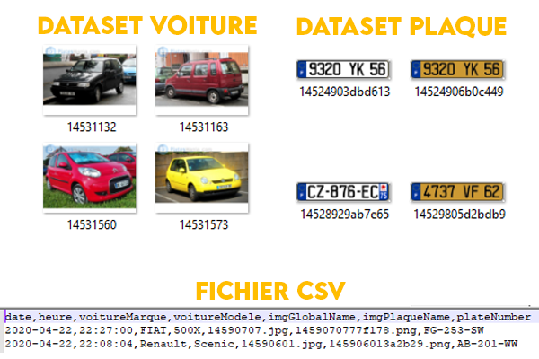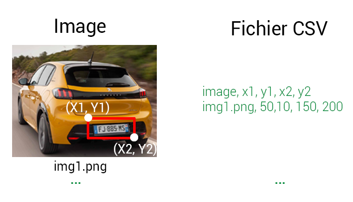 - partie 2 : un fichier CSV ou n'importe quel format permettant de stocker le nom d'une image de voiture (exemple: image1.png) associés aux coordonnées du rectangle contenant la plaque.