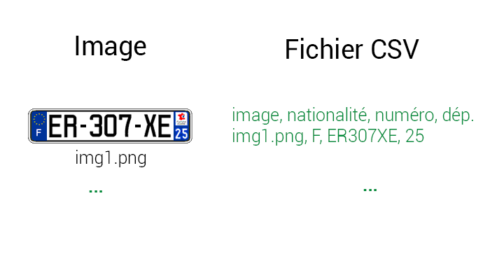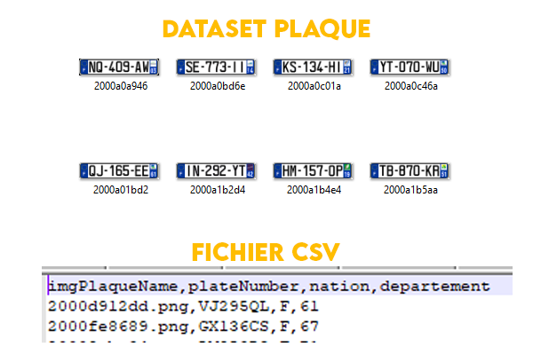- partie 2 : un fichier CSV ou n'importe quel format permettant de stocker le nom d'une image d'une plaque (exemple: image1.png) associés au caractères présent sur la plaque.