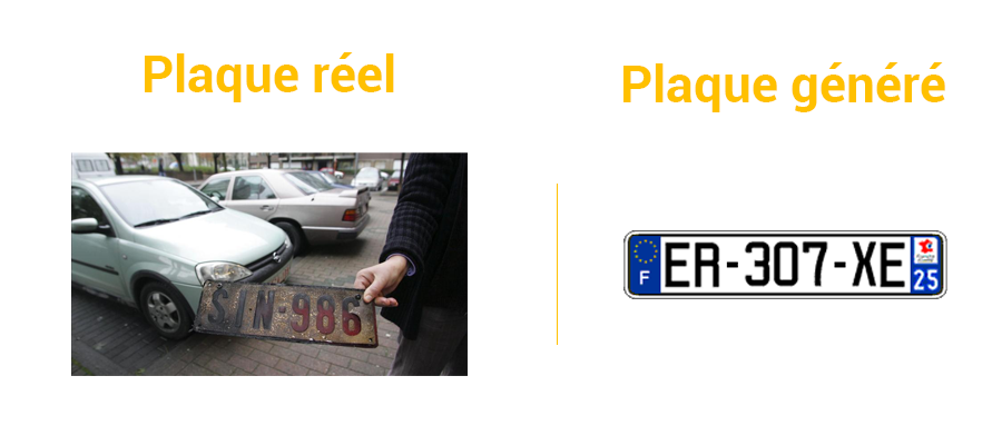 On pourrait réaliser un système de génération de plaque d’immatriculation pour remplir le dataset 2 (comme le fait l'API du site précédent), ou encore coller ces plaques générées sur des photos aléatoires de Google. En effet, notre réseau de neurones 1 n'a pour but que de détecter, de localiser, et de fournir la position de la plaque au sein de la photo, rien de plus. Donc que l'on prenne de vraies photos de voiture avec de vraies plaques d'immatriculations placé au vrai endroit revient au même pour notre réseau que de générer une plaque aléatoire, et de l'insérer dans une photo aléatoire.