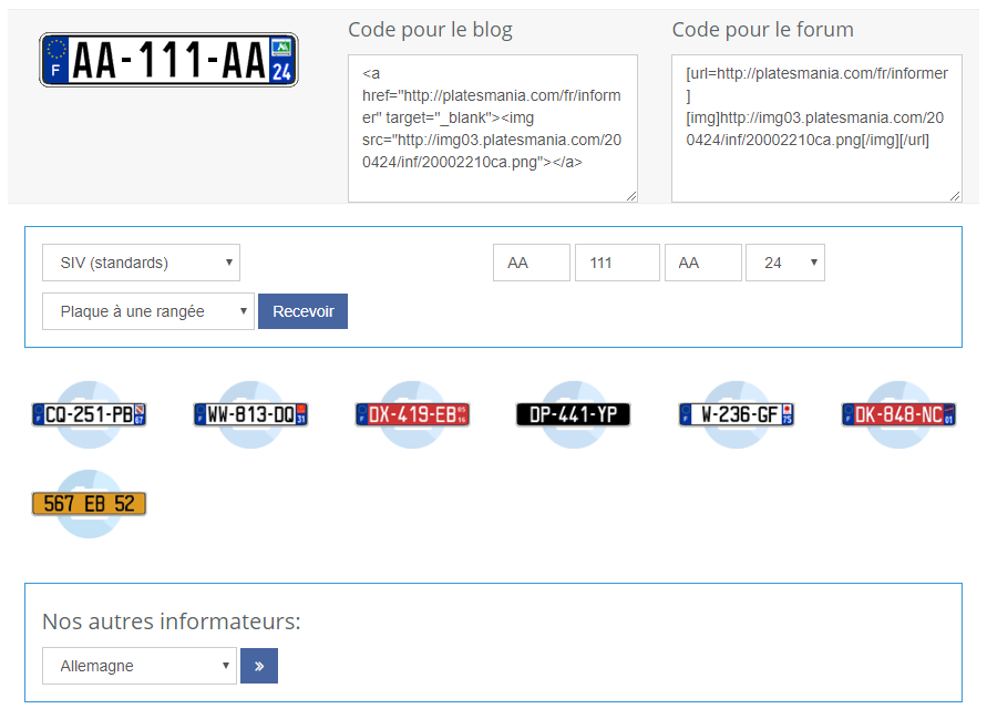 Je me suis dit pour augmenter notre dataset de façon bien plus conséquente, qu'il serait intéressant d'avoir un générateur de plaque avec des caractères aléatoire. Une image de plaque d'immat est simple à réaliser en effet. Et il se trouve que sur ce même site il y a un système permettant de réaliser nos plaques sur mesure via leur API :