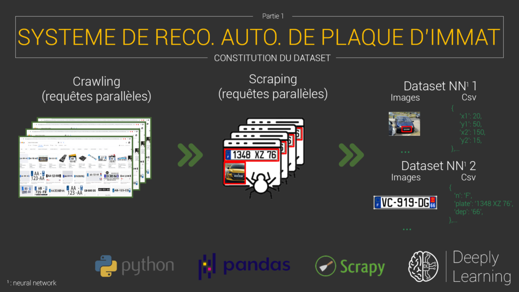 date: date à laquelle la photo a été upload sur le site distantheure: heure à laquelle la photo a été upload sur le site distantvoitureMarque: marque de la voiturevoitureModele: modèle de la voitureimgGlobalName: nom de l'image de la voiture global que je vais enregistrer en localimgPlaqueName: nom de l'image de la plaque que je vais enregistrer en localplateNumber: numéro de la plaque d'immatriculationpage: numéro de la page en cours de scrapingmaxPage: nombre de page max à parserDIRECTORY\_IMG\_PLATE: dossier de destination pour enregistrer les images PNG de la plaque seuleDIRECTORY\_IMG\_GLOBAL: dossier de destination pour enregistrer les images PNG de la voiture globaleGLOBAL\_DATA: fichier CSV qui sera lu par la librairie Pandas