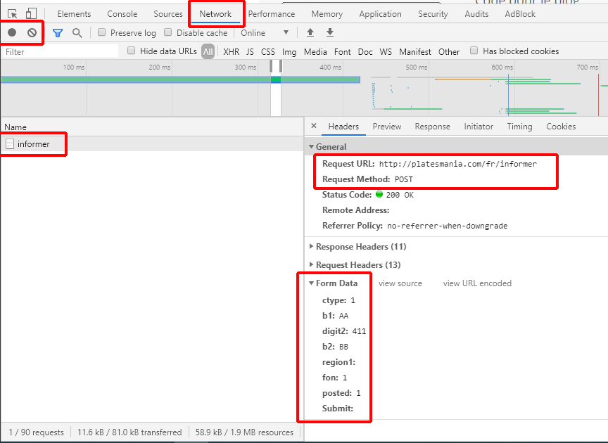On va maintenant aller voir du côté réseaux et des paquets qui y sont échangés. Vous pouvez enregistrer sur des périodes, l'ensemble des requêtes qui transite de vous au serveur, permettant de voir les informations qui y sont échangés. J'ai lancé mon enregistrement, puis j'ai cliqué sur le bouton pour générer une plaque. Dans l'onglet Network, vous aurez pleins de requêtes. A vous de les analyser pour récupérer les informations dont vous souhaitez.
