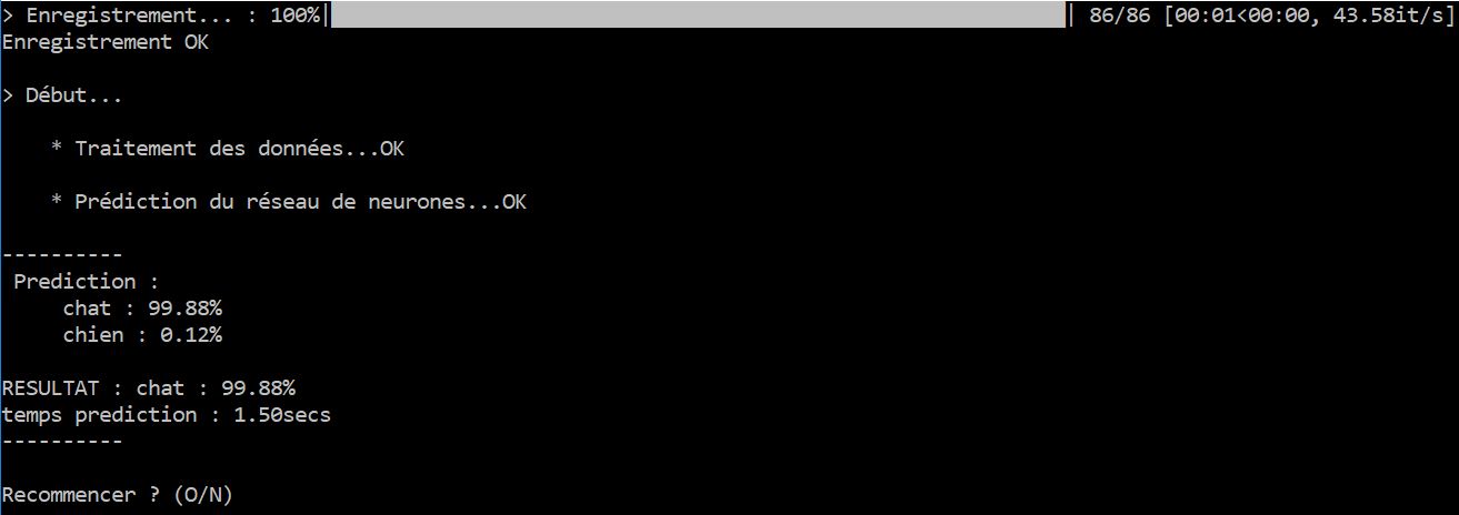 Enfin la partie intéressante ! Maintenant que notre modèle est entraîné, on va enfin pouvoir réaliser des prédictions sur de nouveaux audio. Pour cela, on va lancer notre fichier autoPredict.py qui va enregistrer le microphone sur une période de deux secondes. Celle-ci est importante, et doit correspondre à la même longueur que les extraits audio de notre jeu de donnée sur lequel notre réseau s'est entraîné. En effet, pour obtenir des résultats probants, il faut obligatoirement comparer des choses comparables, et donc avec des caractéristiques semblables (la durée dans notre cas). Nous aurons ensuite une conversion de ces audios en spectre, et enfin une dernière transformation en tenseur via Numpy. Nous aurons en sortie de notre réseau une probabilités selon nos 2 classes de sortie, qui sont Chat et Chien.
