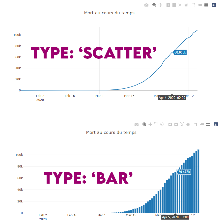 Je vous présente quelques attributs plutôt chouettes pour changer rapidement le sous type de nos graphiques que je vous ai présenté précédemment, à savoir Scatter et Bar