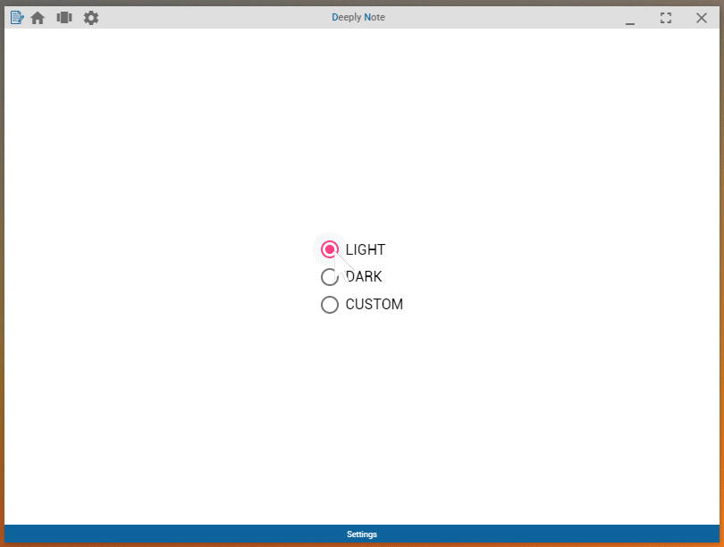 Pour la vue de notre page de paramètres, faisons quelque chose de simple. On va disposer d'un groupe de bouton radio, permettant une sélection unique du thème. Cela nous rampement de choisir entre Light, Dark et Custom. Les deux premiers thèmes ayant des couleurs définit dans notre application, seul le Custom pourra être modifiable, histoire de laisser un maximum de liberté à l'utilisateur dans le choix de ses couleurs. Pour la vue, rien de bien complexe :