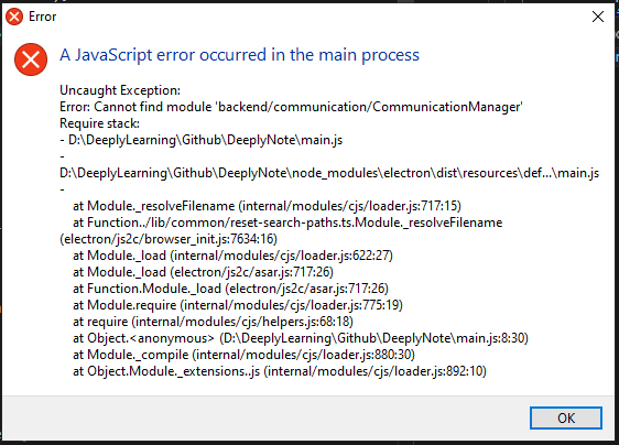 Vous avez enfin une belle architecture, écrite en TS, et vous avez TSC de configuré. Aucune erreur sur l'ensemble de vos consoles, super, vous pouvez lancer Electron... et BIM ! Une belle erreur devrait apparaître, comme quoi vos nouveaux composants fraîchement crées ne sont pas trouvable 😒. Tsc étant un transpiler simple, il ne fait pas la liaison entre les composants lorsque on utile des imports absolue. Cependant si vous utilisez des importation de module avec des liens relatifs, vous n'aurez pas de soucis. Cependant, l'écriture de ces imports rend leur lecture complexe, en voici un exemple :