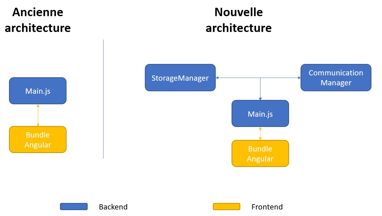 - StorageManager : on va lui déléguer l'ensemble des fonctionnalités de Main.js qui touche l'ensemble des serialization des données du module electron-store