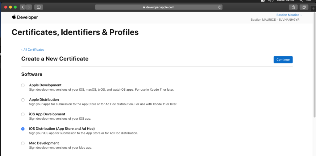 Sélectionnez le certificat précédemment crée, et faîte Continue :