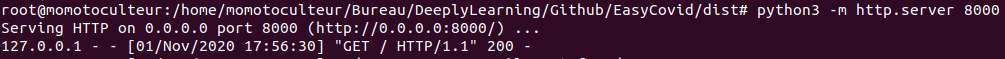 On va maintenant lancer notre application à partir du bundle crée précédemment, en local. Pour cela on va utiliser python. Déplacez vous dans le dossier "dist" précédemment crée, et lancer la commande suivante :